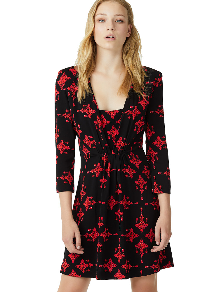 Stampa di raffinati rubini dagli accenti baroque colorano il nuovo abito corto proposto da Liu Jo.